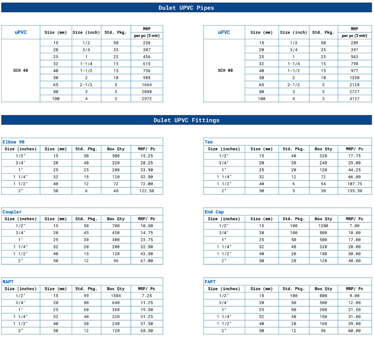 Dulet UPVC pipes are lead-free, thus ensuring a safe and clean environment for portable water. They are easy to fit and economical for water distribution. These pipes are fabricated according to the ASTM D1785 standard and are available in two variants – SCH 40 and SCH 8.